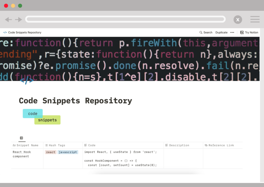 A Notion template to organize your code snippets. You can add tags and reference links so that you can visit the source incase you want to read more about it.